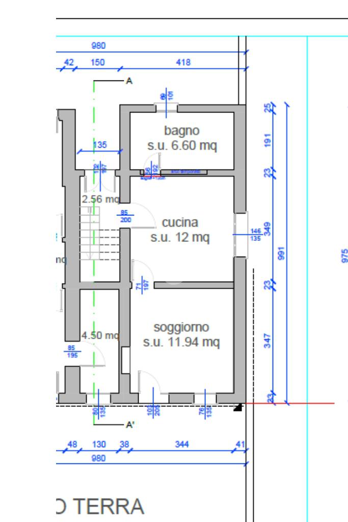 Piano terra: soggiorno, cucina separata e bagno finestrato.