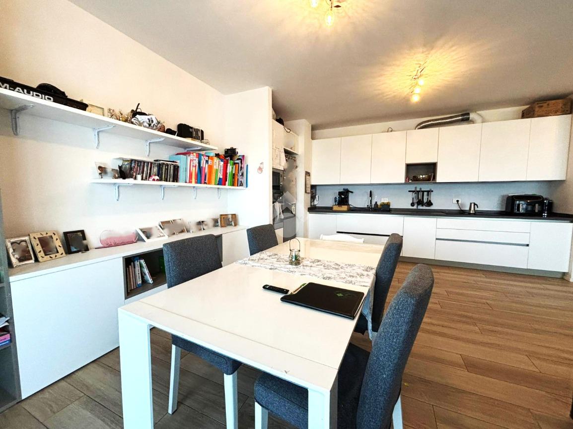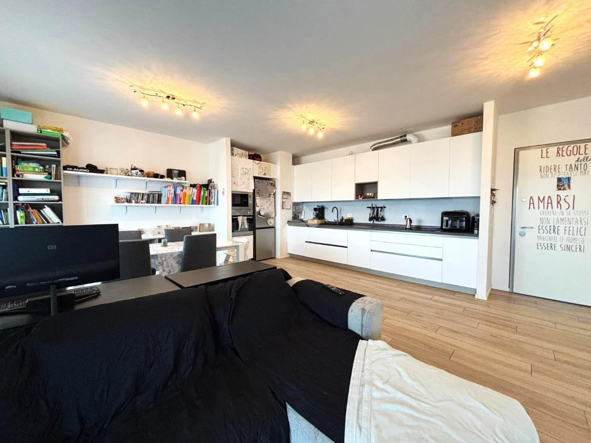 L’ingresso conduce alla luminosa zona giorno composta da soggiorno con cucina a vista e accesso diretto a un ampio terrazzo abitabile di circa 15 mq, ideale per momenti di relax o convivialità all’aperto.