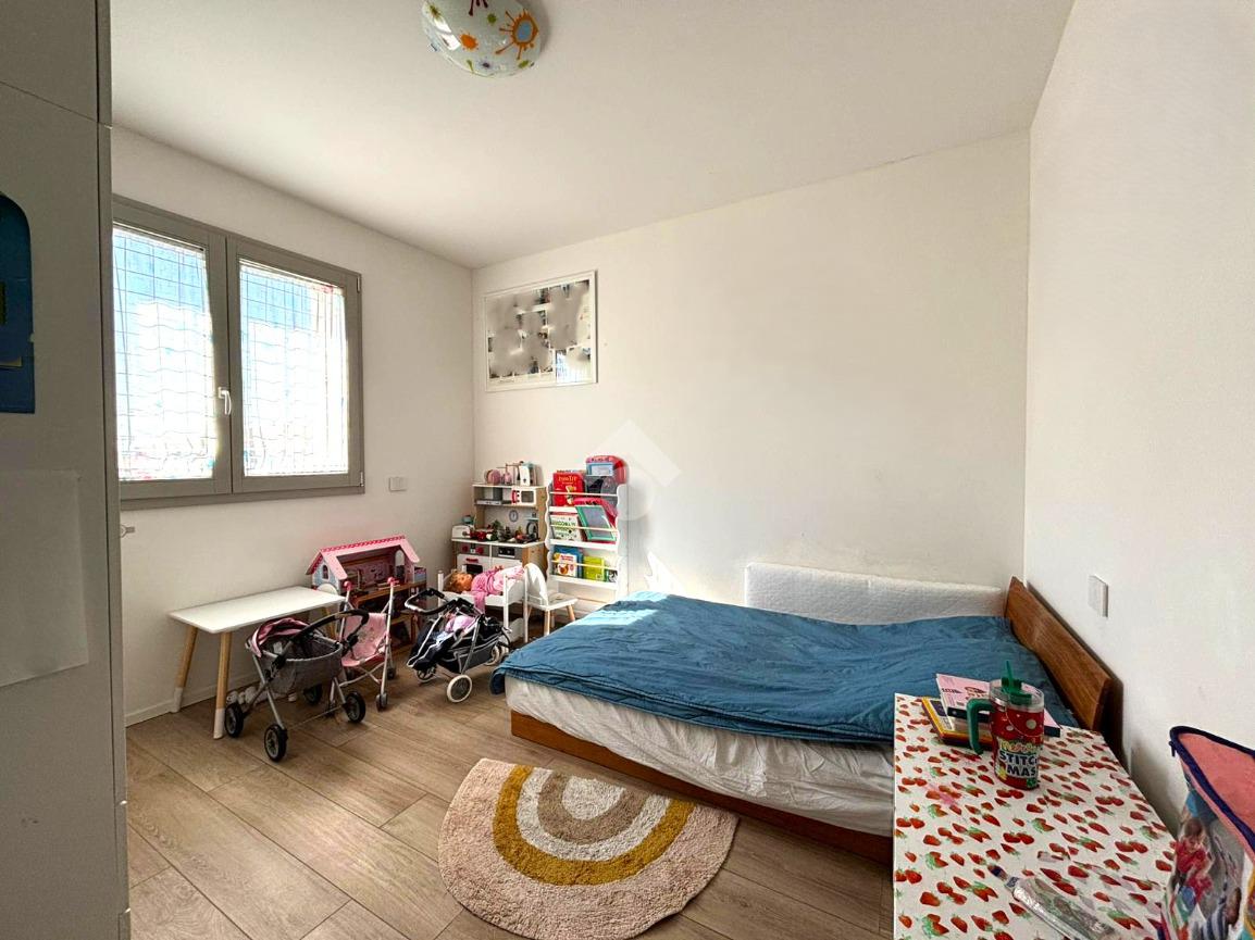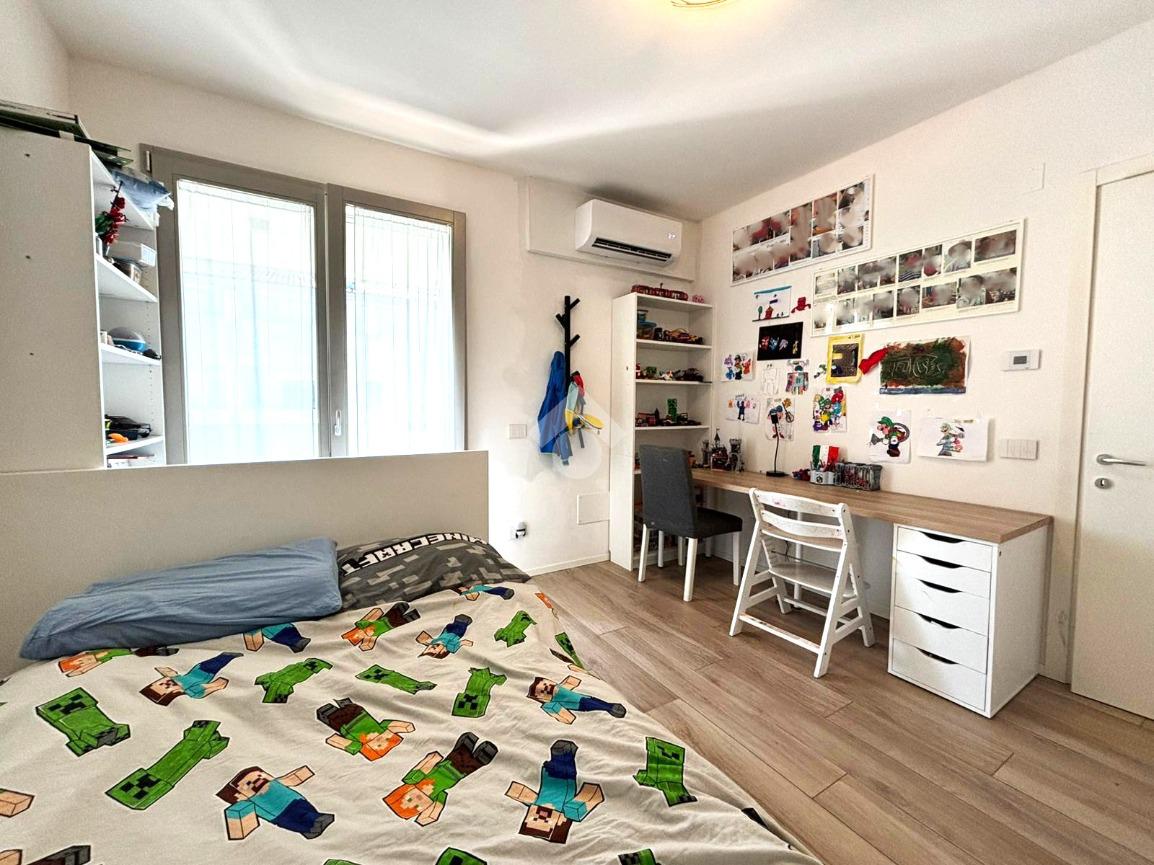Attraverso il disimpegno si accede alla zona notte, composta da una camera matrimoniale con terrazzo privato di circa 8 mq, due camere singole, un bagno finestrato con box doccia e un secondo bagno cieco, anch’esso con box doccia, attualmente adibito a lavanderia.